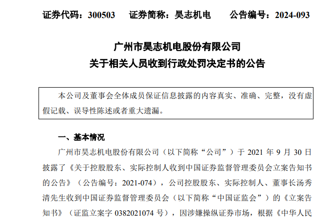 昊志机电表示,上述《行政处罚决定书》的事项内容仅涉及公司控股股东、实际控制人、董事长汤秀清和公司董事、董事会秘书、副总经理、财务总监肖泳林个人,不会对公司的生产经营及财务状况产生重大影响。