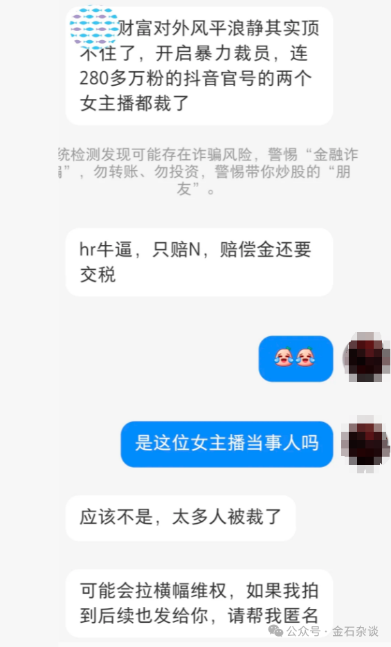 据该博主粉丝爆料,某大型互联网券商表面上风平浪静,实则已经开启大力裁员模式,甚至连280万粉丝的抖音官号的两个女主播都被裁了。