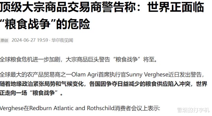 对于粮食供需失衡的关注,让新加坡大型农贸商Olam Agri发出了“世界正面临粮食战争”的示警。
