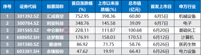 本月以来,累计共有6只新股登陆A股市场。从首日表现上看,其平均上涨近273.5%,其中,汇成真空首日大涨近752.95%,位居年内新股首日涨幅榜首位,利安科技、中仑新材、达梦数据3股首日也迎来分别大涨。